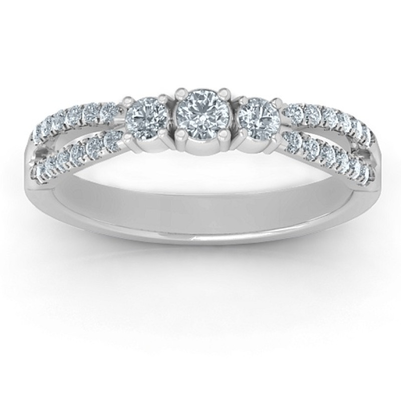 Main Stone: One 3mm Round Stone Secondary Stones: Two 2.5mm Round Stones Accent Stones: 24 1.25mm Round Stones Max Ring Width: 3.5mm Min Band Width: 2.5mm; Max Band Width: 2.8mm.This trinity ring is so sentimental, she is sure to treasure it forever! The centre stone is slightly bigger than the other two and it represents the present; how much you love her today and remembering to live in the moment and be thankful for the ability to spend this day as her sweetheart. The other two stones represent the past and the future; everything building up to the life changing promise you are about to make and everything that will follow it. It is the past that shaped you and brought the two of you together and it is the future that you are looking forward to as a couple. Celebrate the memories you share, the moment you are reveling in and the dreams for what lies ahead with this amazing promise ring.