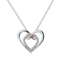 Elevate your style with this Sterling Silver Double Heart Infinity Diamond Pendant Necklace, featuring a striking two-tone finish in silver and rose gold. This exquisite piece showcases an 18ct rose gold-plated infinity symbol intertwined with sterling silver hearts, each adorned with sparkling, round clear diamonds. This elegant necklace is designed specifically for ladies looking to add a touch of timeless elegance and romance to their jewelry collection. This necklace comes with sterling silver rolo chain in 40+5cm length.