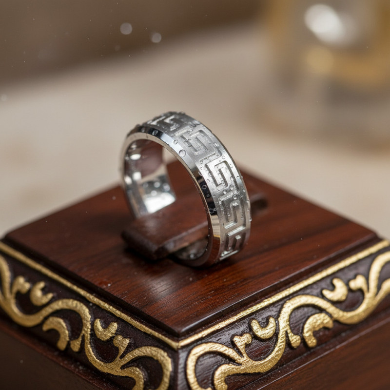 Inspired by an ancient Greek key design, this ring's grooved geometric pattern symbolizes the eternal flow of life and love. If you want to have a ring with some meaning behind it, this is the ring for you. Each ring can be hand-crafted in your choice of silver, white gold, or yellow gold (18K) and 6mm, 7mm, or 8mm width. Engrave the inside with a name or special date to make it truly unique.
